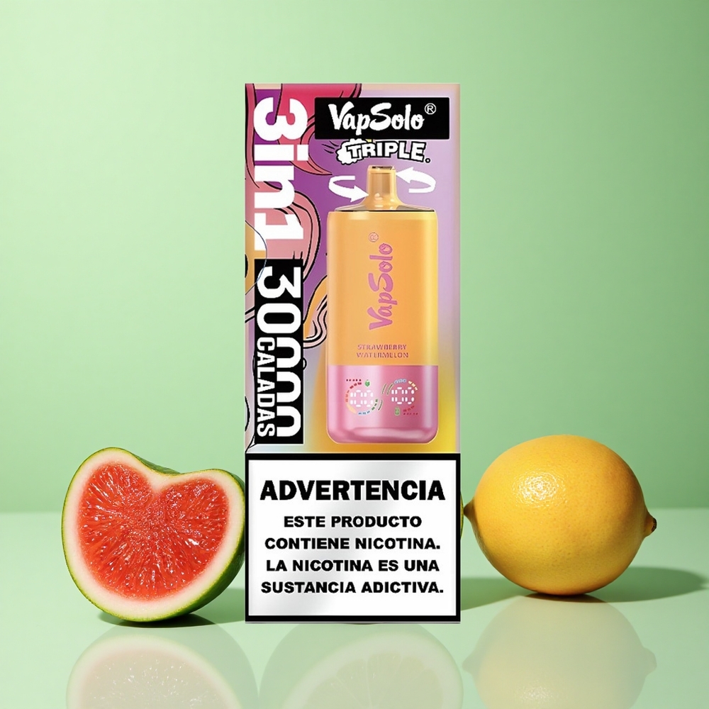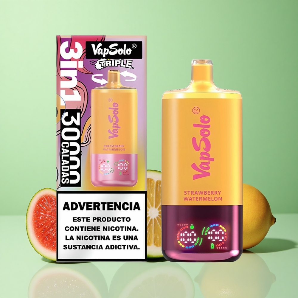VapSolo Triple 30000 Puffs Jordbær Vandmelon & Citron Fersken 40ml E-Væske 3 Olie Tanke Denmark wholesalers